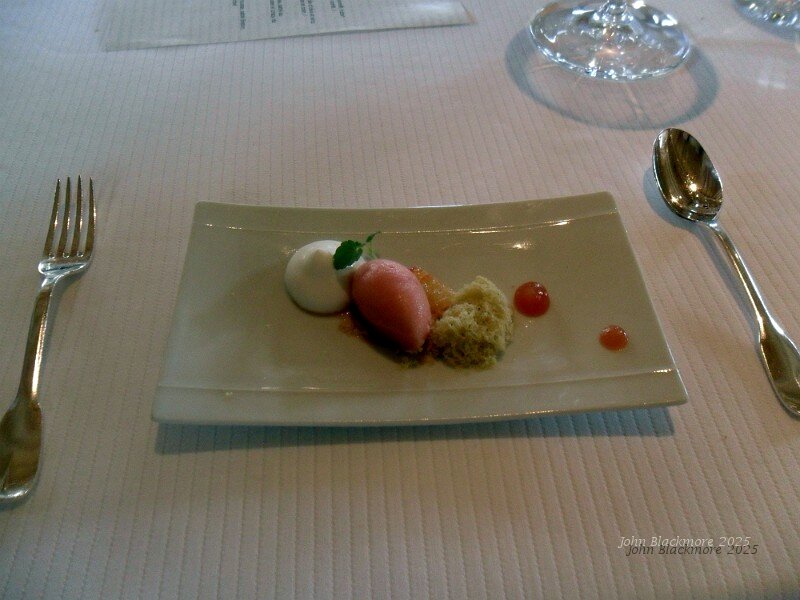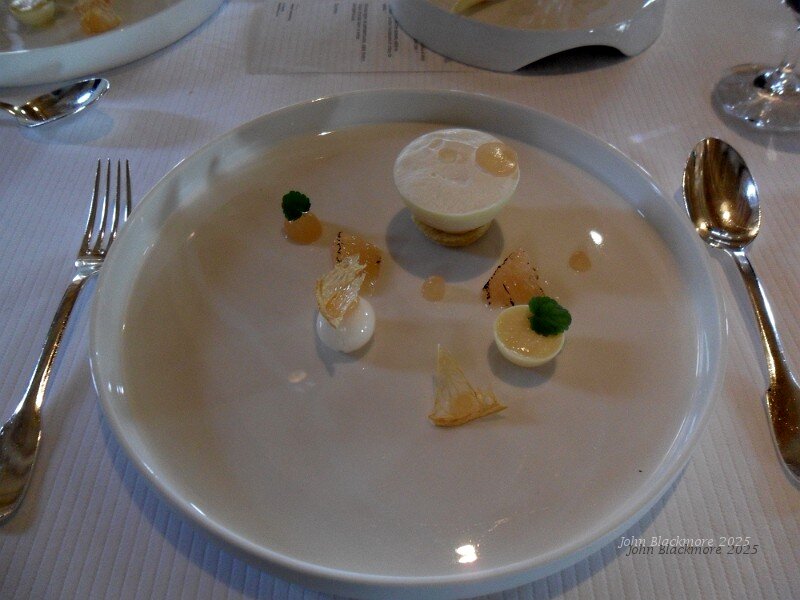 dessert: Mousse légère de pamplemousse, sablé Breton, coque chocolat blanc et sorbet