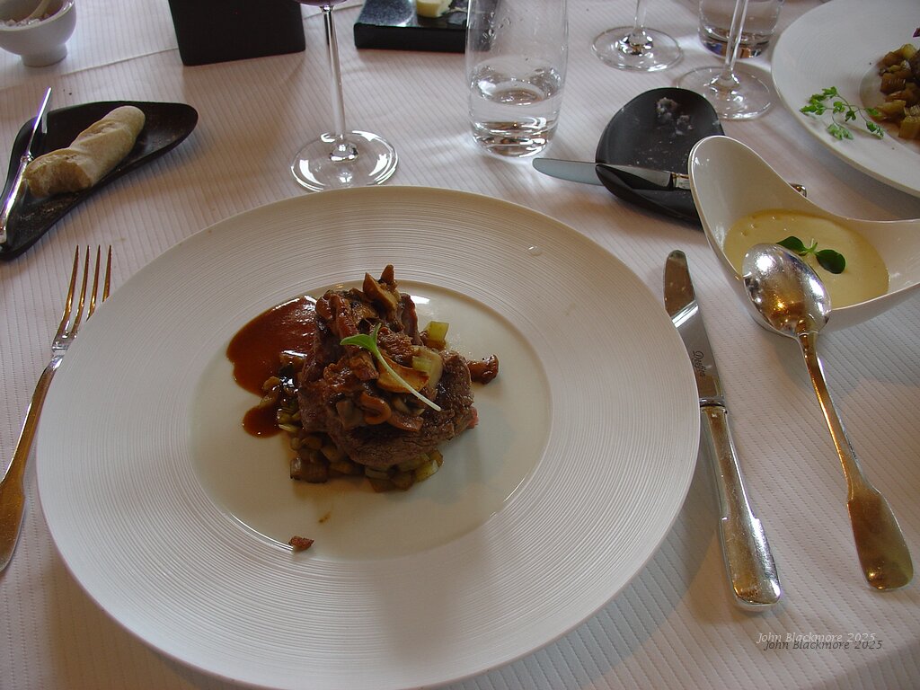 Beef fillet topped with fungi on diced celery with pureed creamy potatoes