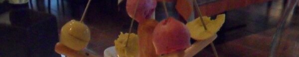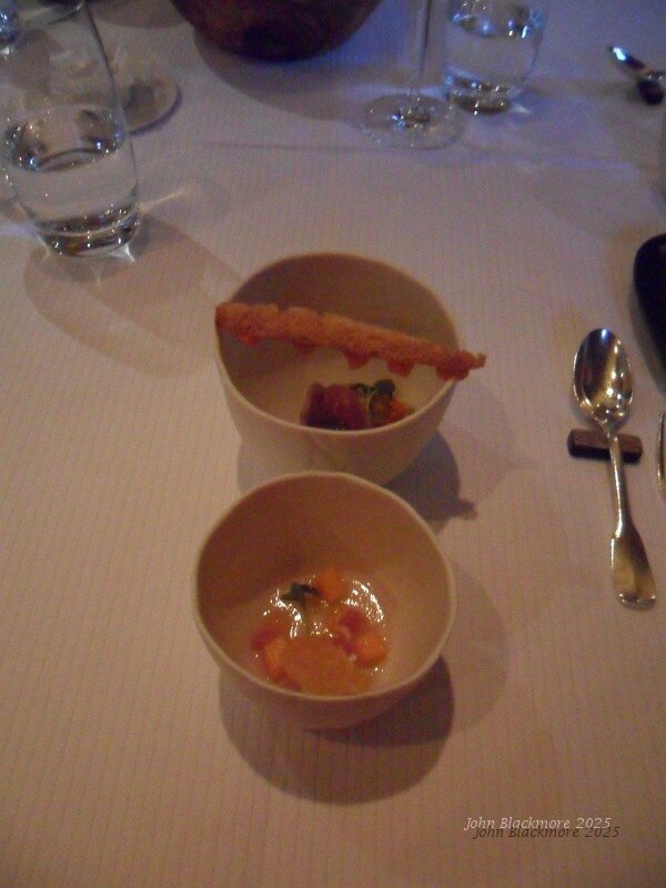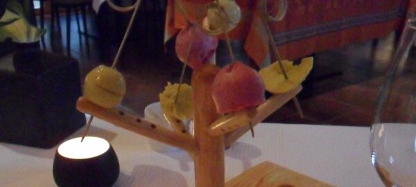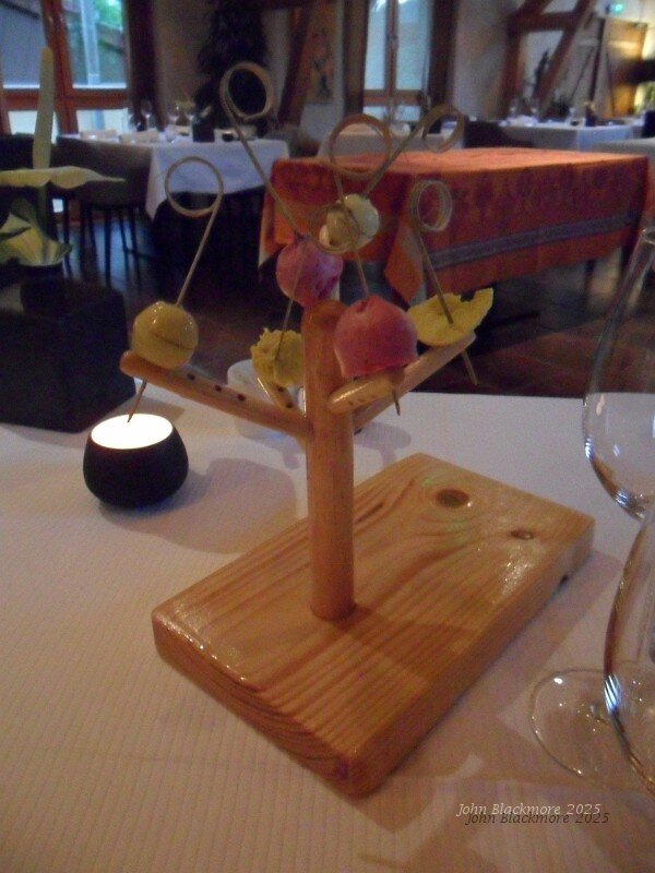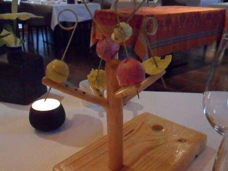Amusettes and broutilles: asparagus crisp, aubergine and pea ball, foie gras in cassis