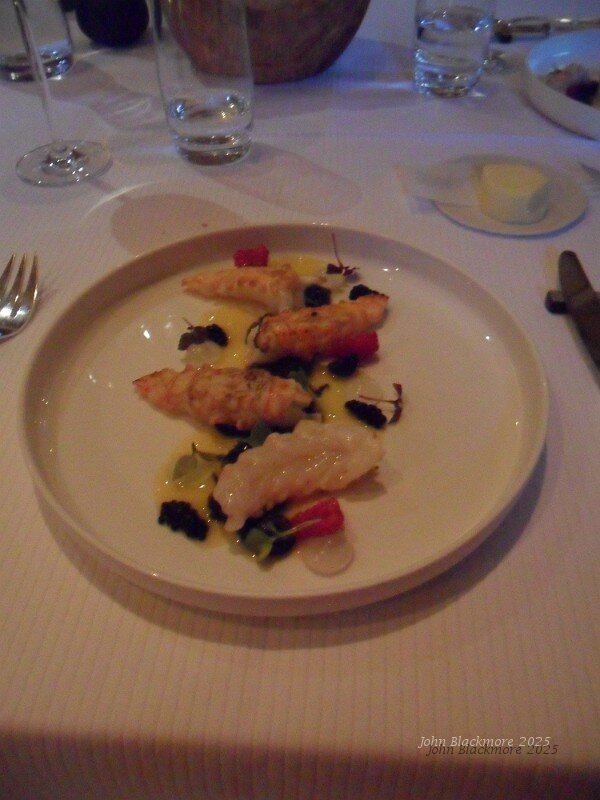 Langoustines rôties, konbu et passion, framboise et citron vert, oeuf de hareng