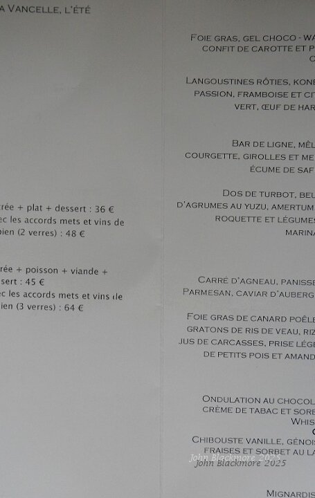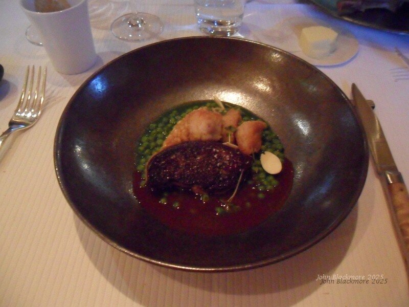 Main: foie gras de canard poêlé et gratons de ris de veau au jus de carcasses, prise legere de petits pois et amandes