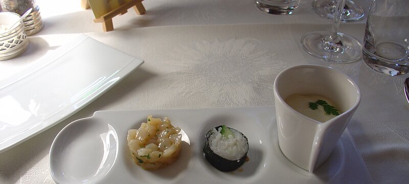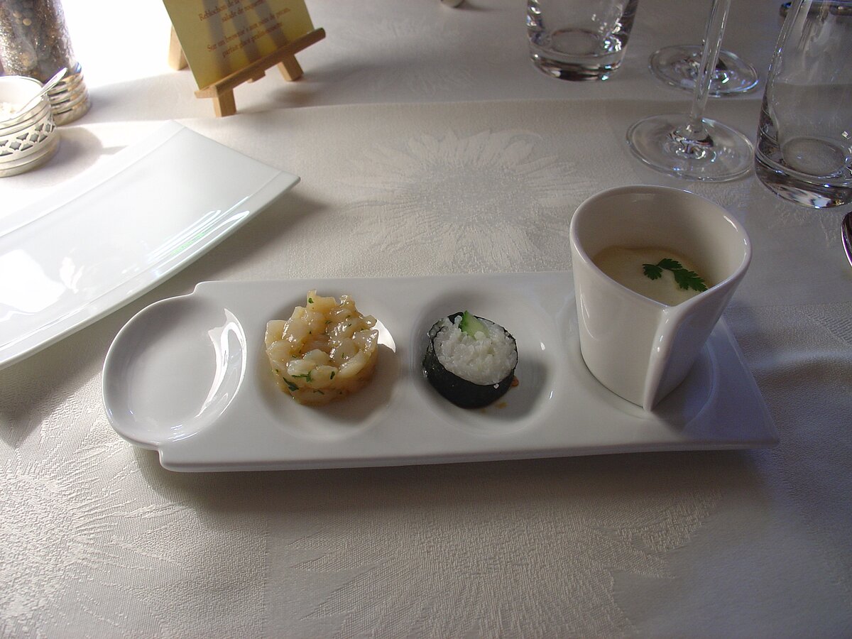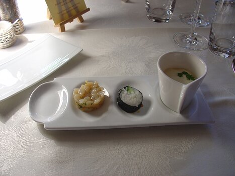 Amuse bouche - parsnip soup/cucumber sushi /emince de Saint Jaques