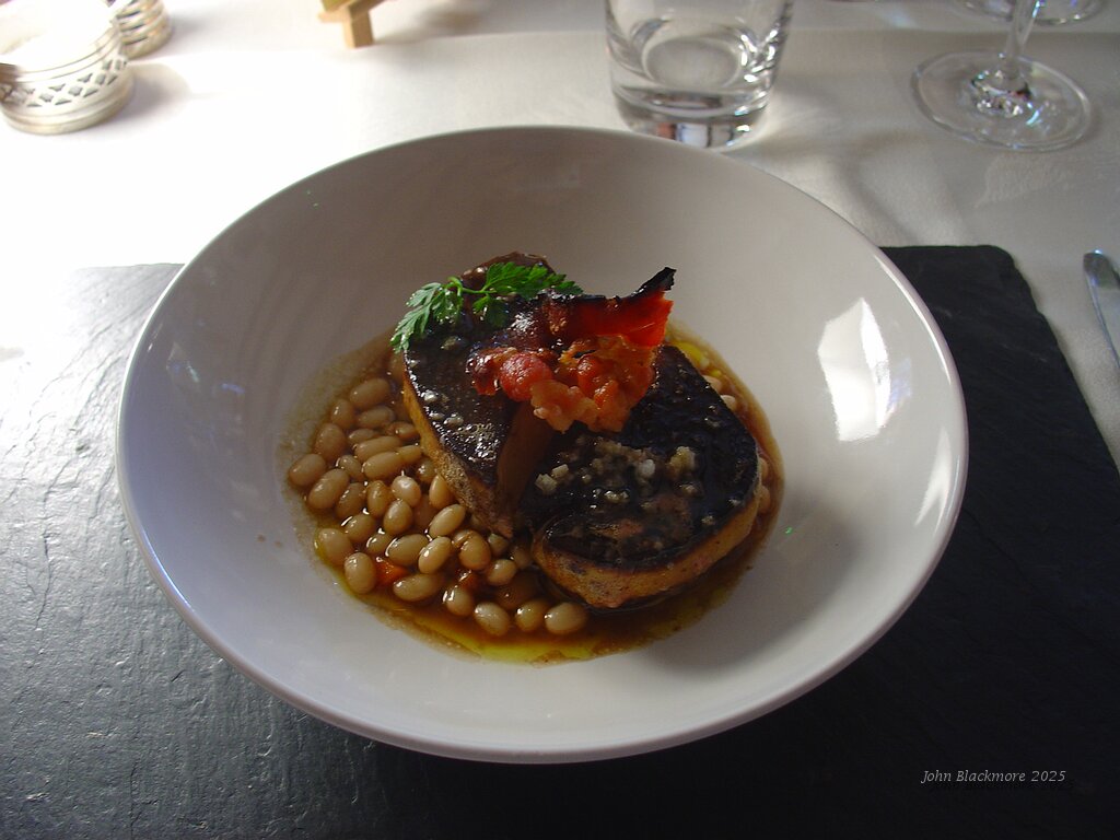 starter - foie gras de canard poêlé, haricots cocos en vinaigrette acidulée, jus perlé à la graisse d'oie