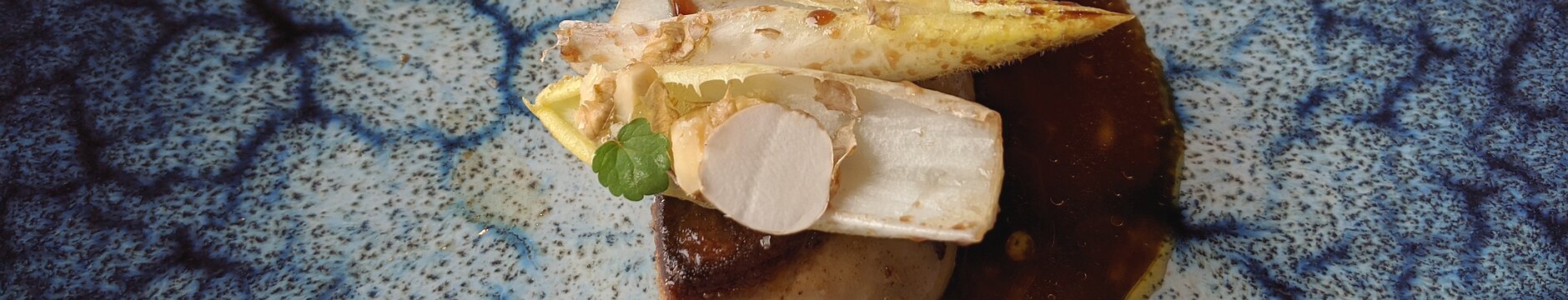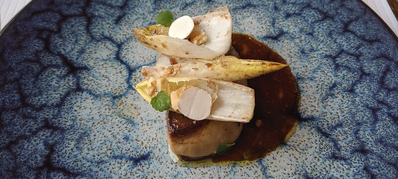 first course: Foie gras rôti, noix et endives en salade, copeaux de champignons de Paris, jus de veau tranché de graisse de canard et miel
