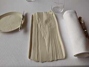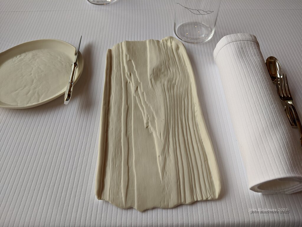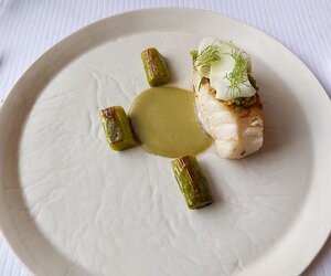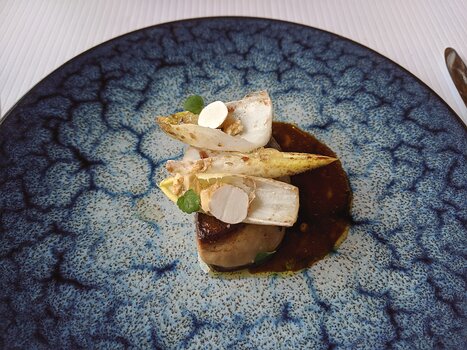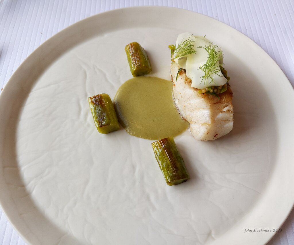 second course: Dos de skreï, poireau grillé en vinaigrette d’aneth, pommes de terre acides et condiment graine de moutarde