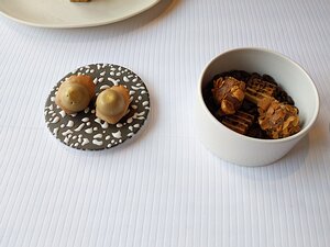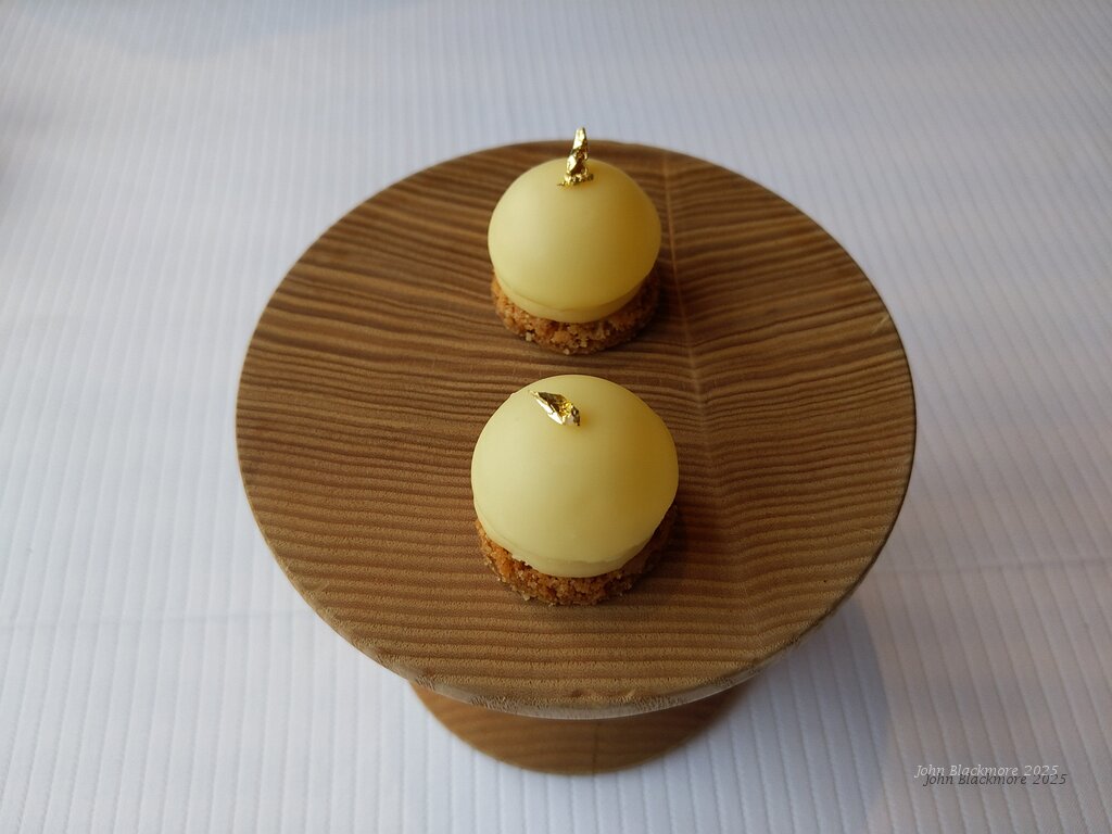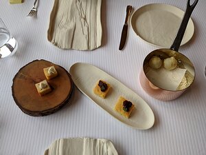 amuse bouches: cauliflower gateau; sablés Bretons with beetroot; mushroom soup-filled white chocolate balls