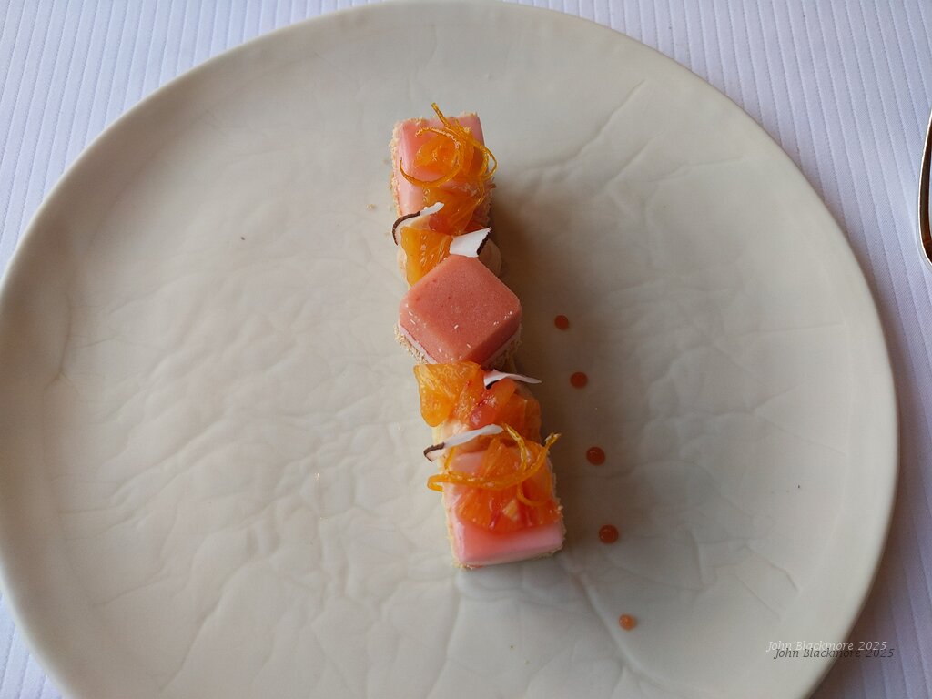 dessert: Sablé à la noix de coco, sorbet orange sanguine, mousse coco et diplomate à l’orange sanguine