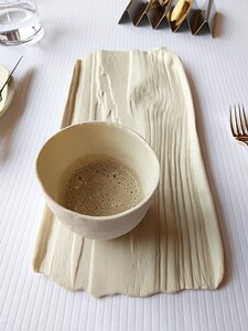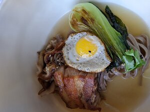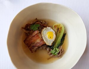 third course: Ramen de poitrine de cochon d’Alsace grillée, œuf de caille, choux, shitake, bouillon épicé et nouilles cuites au jus de soja
