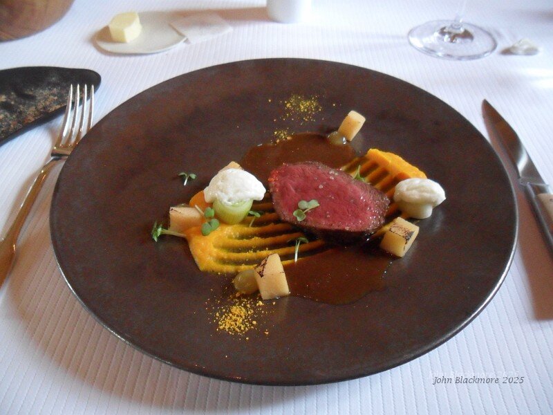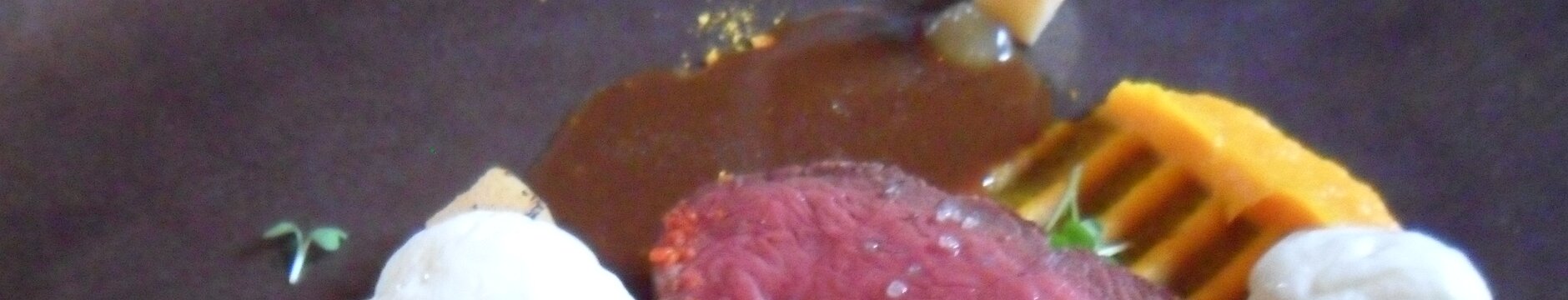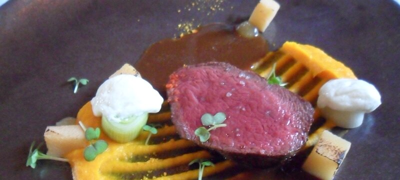 main: Selle de biche, gel et poussiere d'agrumes, potimarron, blanc de poireau et faisselle