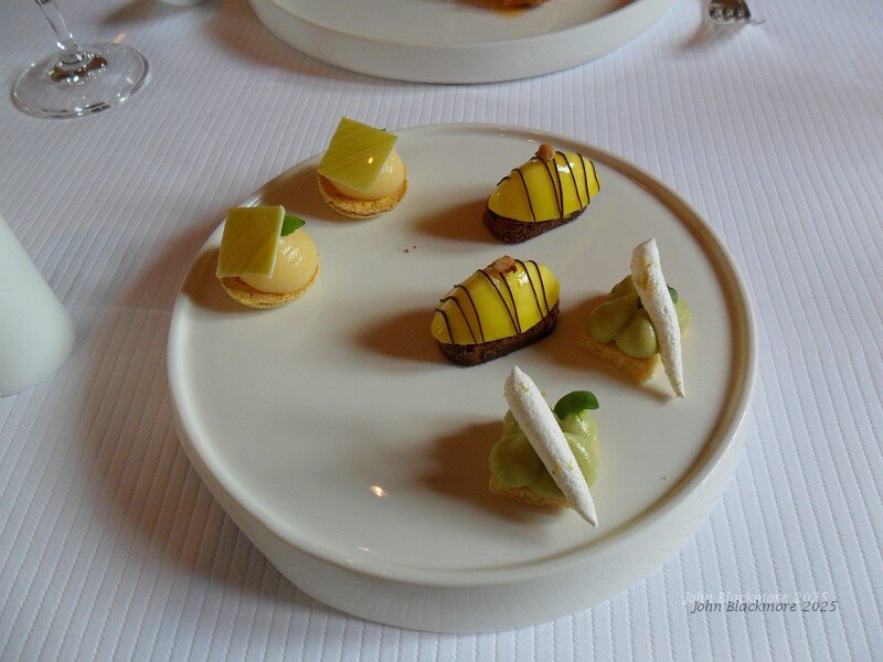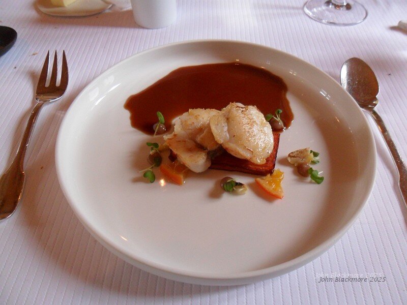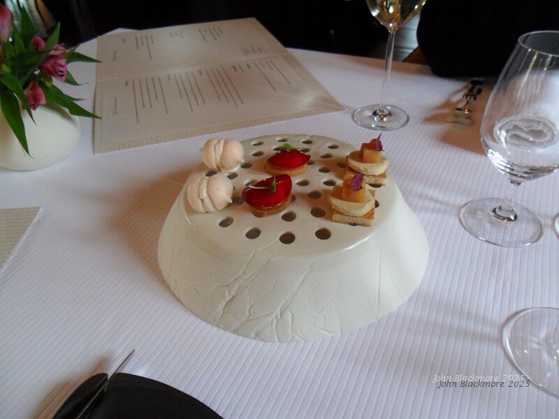 Amusettes: meringue with pumpkin cream, goat cheese with beetroot jelly, foie gras with quince jelly. Not too sure about the "dish" (and the waiter found it difficult to pick up).