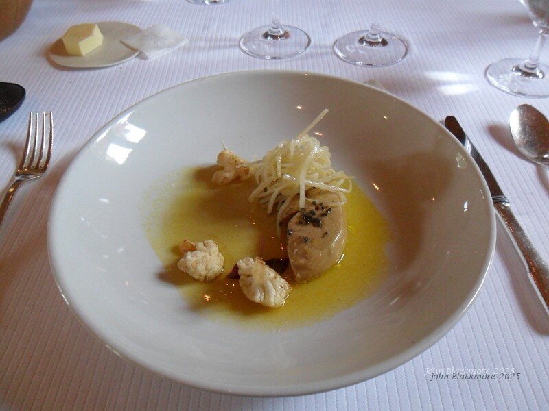 starter: foie gras, jus de passion, files de daikon et chou-fleur