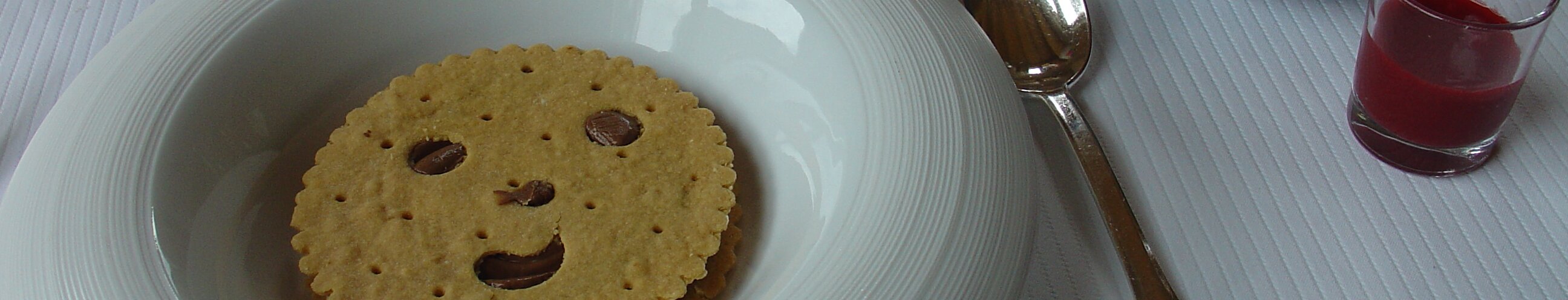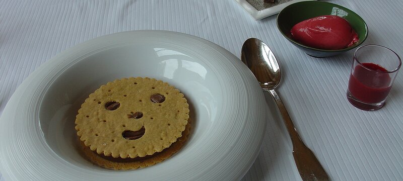 dessert: Frankenbourg version of "Bien" biscuit - filled with chocolate cream and with raspberry coulis and blackcurrant ice cream