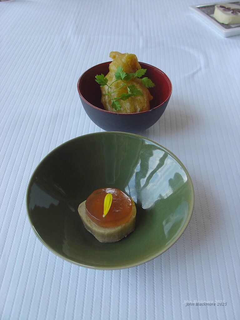 amuse bouche -Fois gras with peach jelly and deep-fried courgette flower with dipping sauce