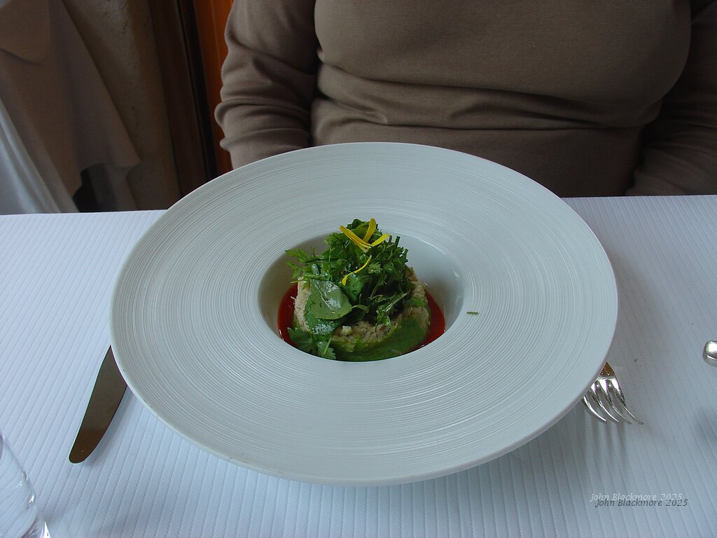 20100726_DSC00732_DSCV1 starter: Crab with petit pois purée and red pepper sauce