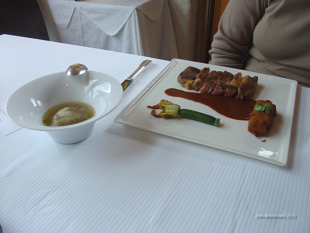 main: Entrecôte steak, courgette, deep-fried grated potato and dim sum