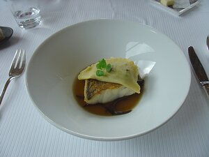 main: Lieu jaune, spinach ravioli and mushroom bouillon