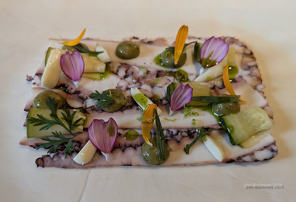 Carpaccio de poulpe et courgettes du jardin marinées aux agrumes et verveine, purée de courgette fumée et amandes fraiches