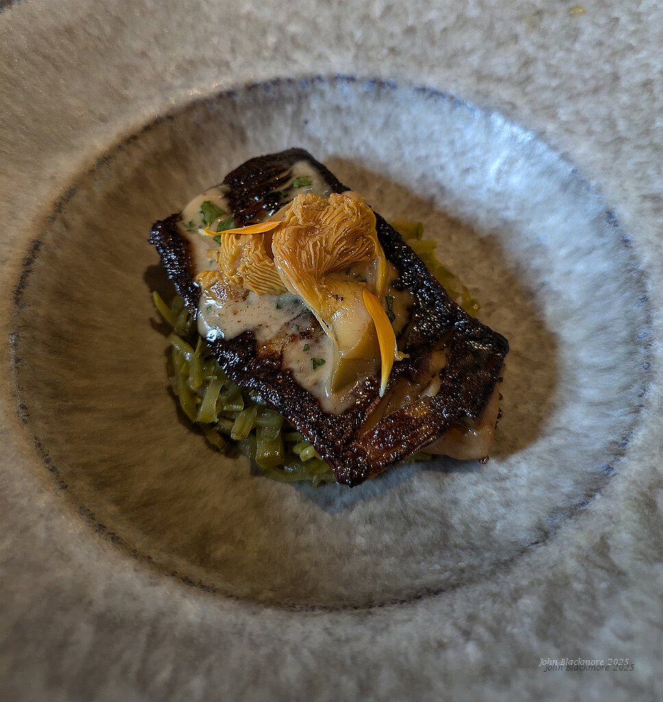 Pois gourmands sautés à cru, maquereau au barbecue, vinaigrette d'arêtes et quelques champignons au vinaigre