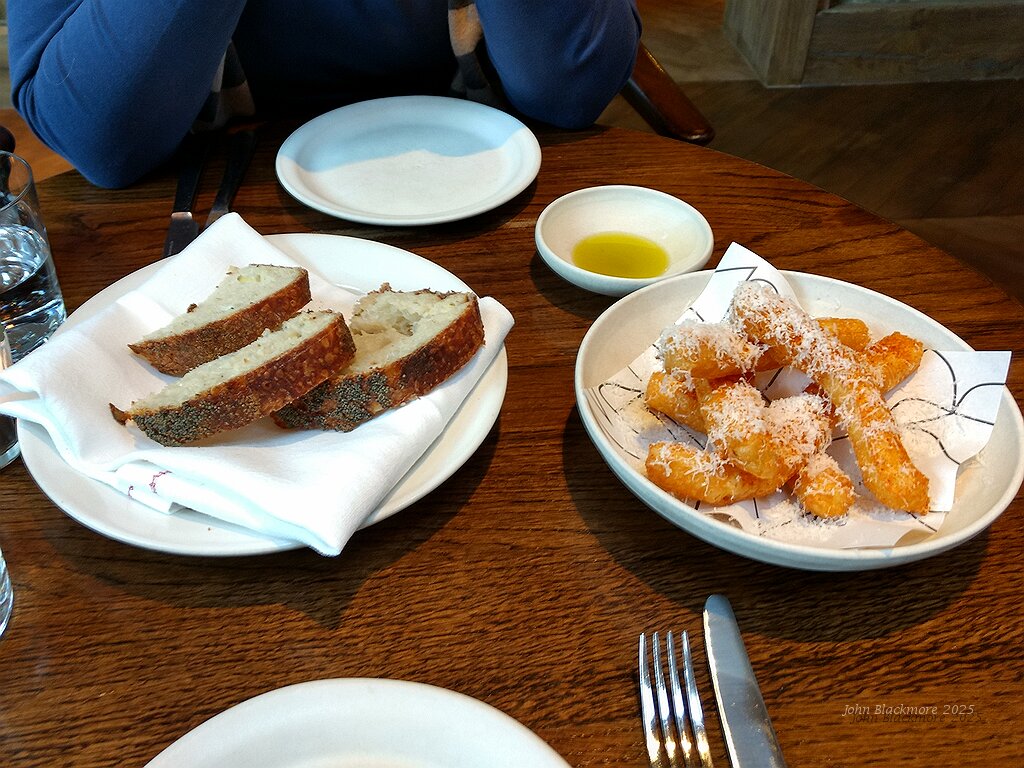 Bread, extra virgin olive oil, and parmesan fries (churros)