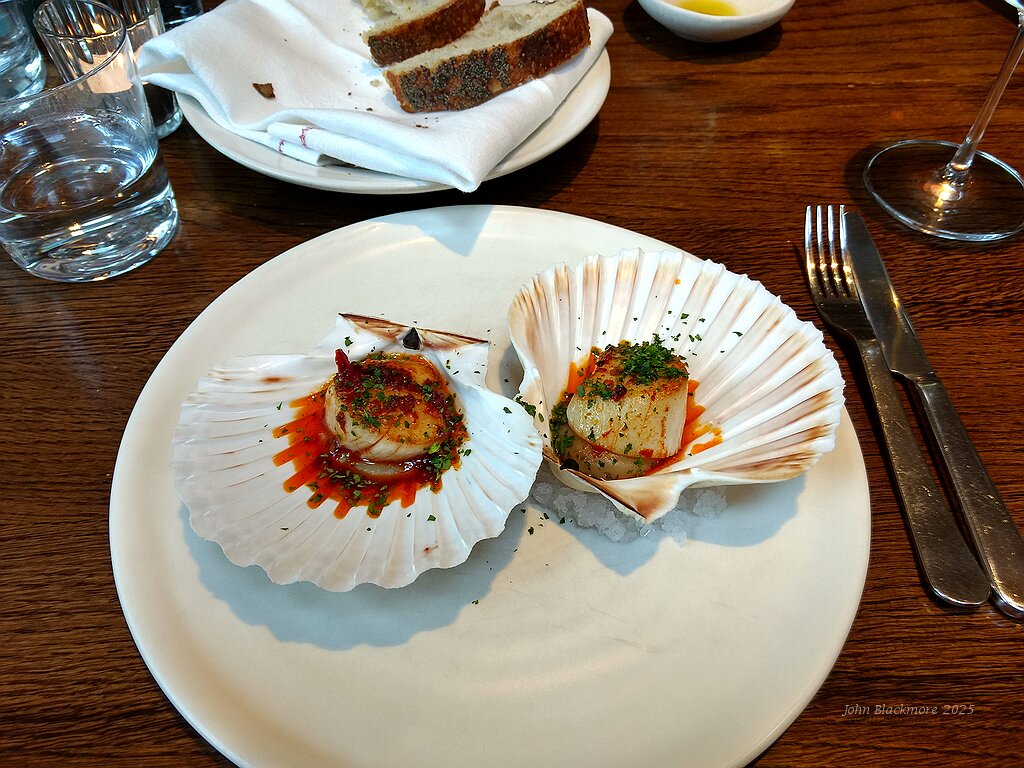 antipasti: Roast Orkney scallops, Jerusalem artichoke and 'nduja (hot pepper pork salumi)