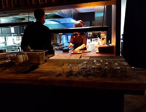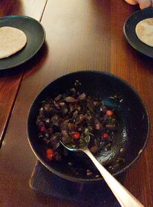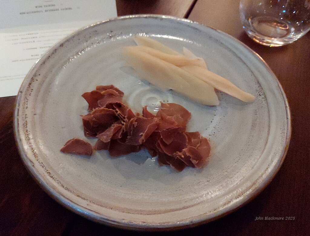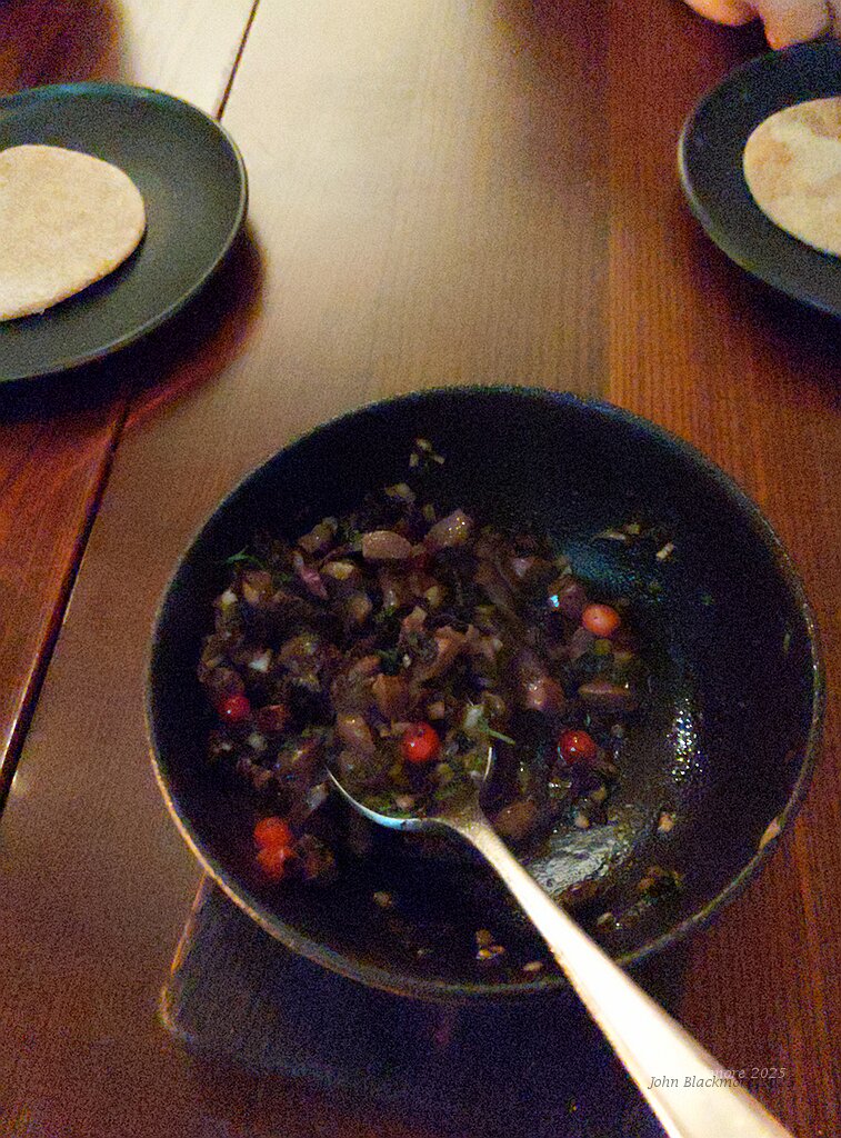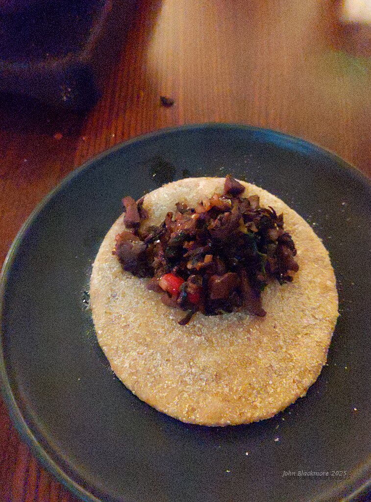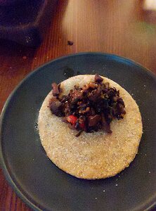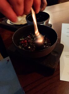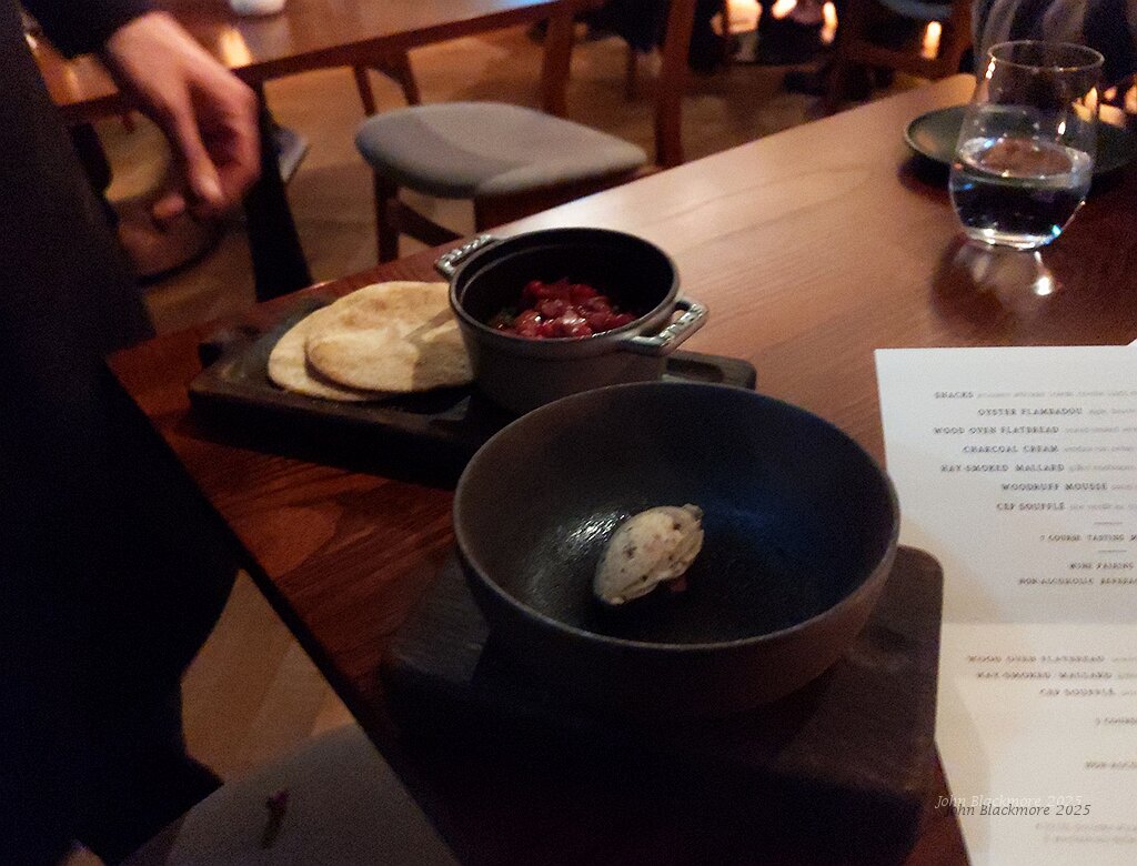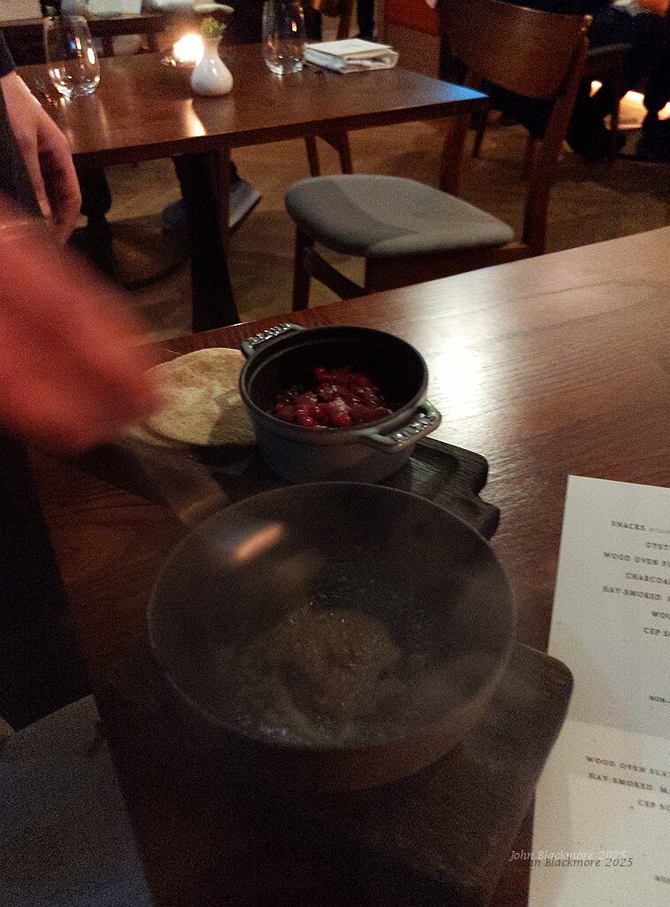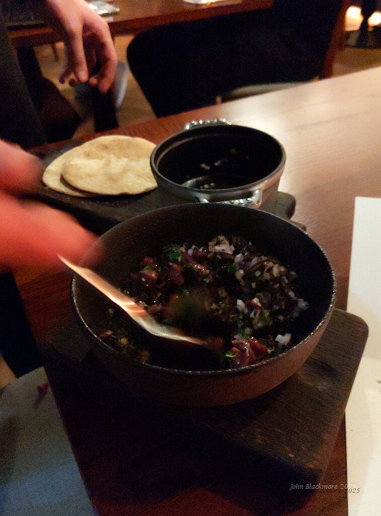 WOOD OVEN FLATBREAD seared smoked venison heart, allspice, lingonberries (shallots, parsley, mushrooms) - butter and allspice melted in heated bowl