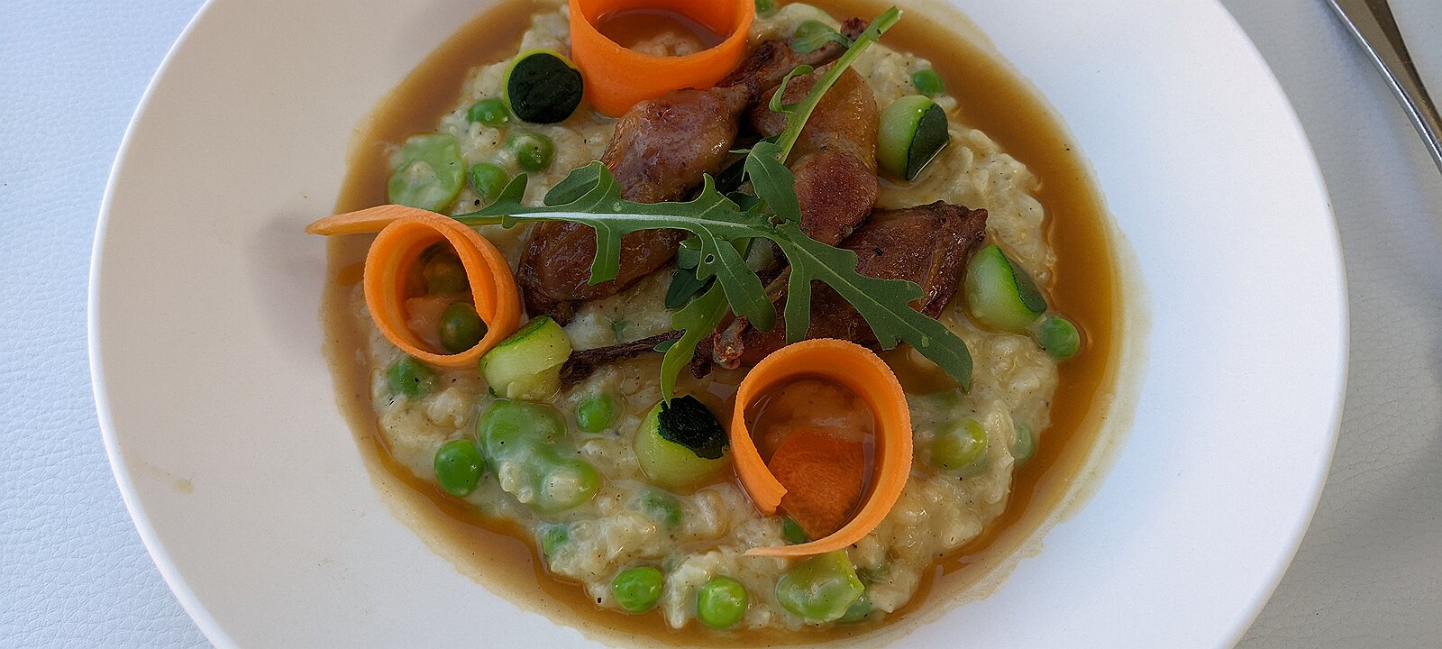 main: Risotto Carnaroli aux écorces de Citron/Fèves/Petits pois, cuisses de Cailles grillées au Tandoori