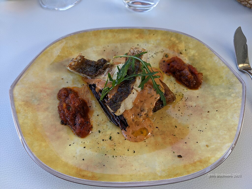 Poisson selon arrivage à la plancha, Millefeuille d’Aubergines grillées/Basilic, Sauce Chorron et Chutney de Tomates
