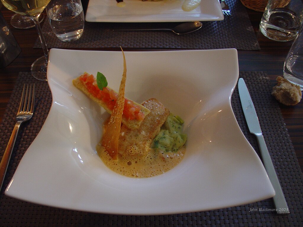 Main: Loup de mer, fondue de fenouil et poireaux, Bruscetta