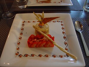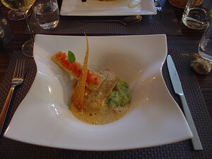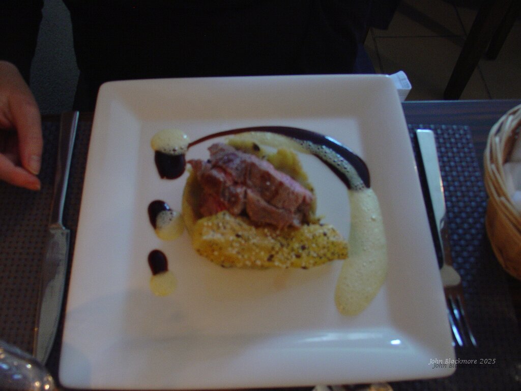 Main: Noix de Veau cuite a basse température, pommes de terre écrasée au Thym, Citron et Olives noires