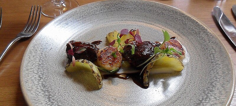 main menu starter: Roasted scallops, glazed pork cheek, smoked pineapple, cauliflower
