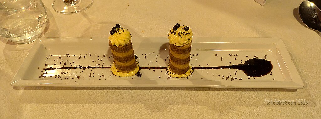 (Au gratin cod fish with almonds, pepper cream and aubergine with mint)