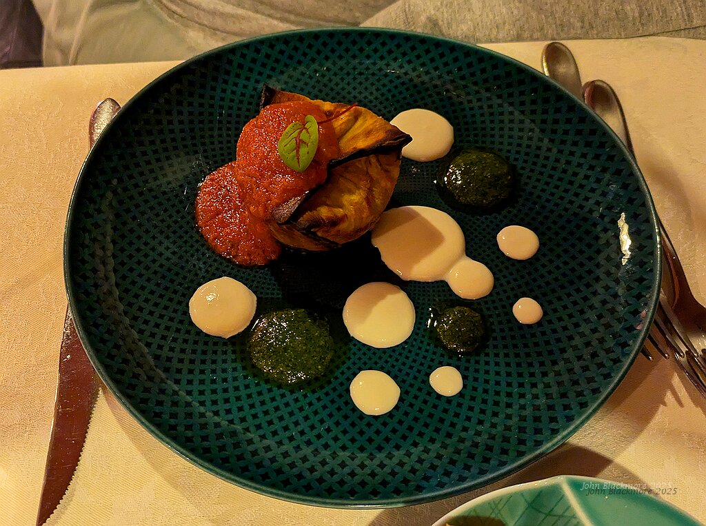 (Roasted octopus, Castelmagno fondue, nettle and peach) 24€