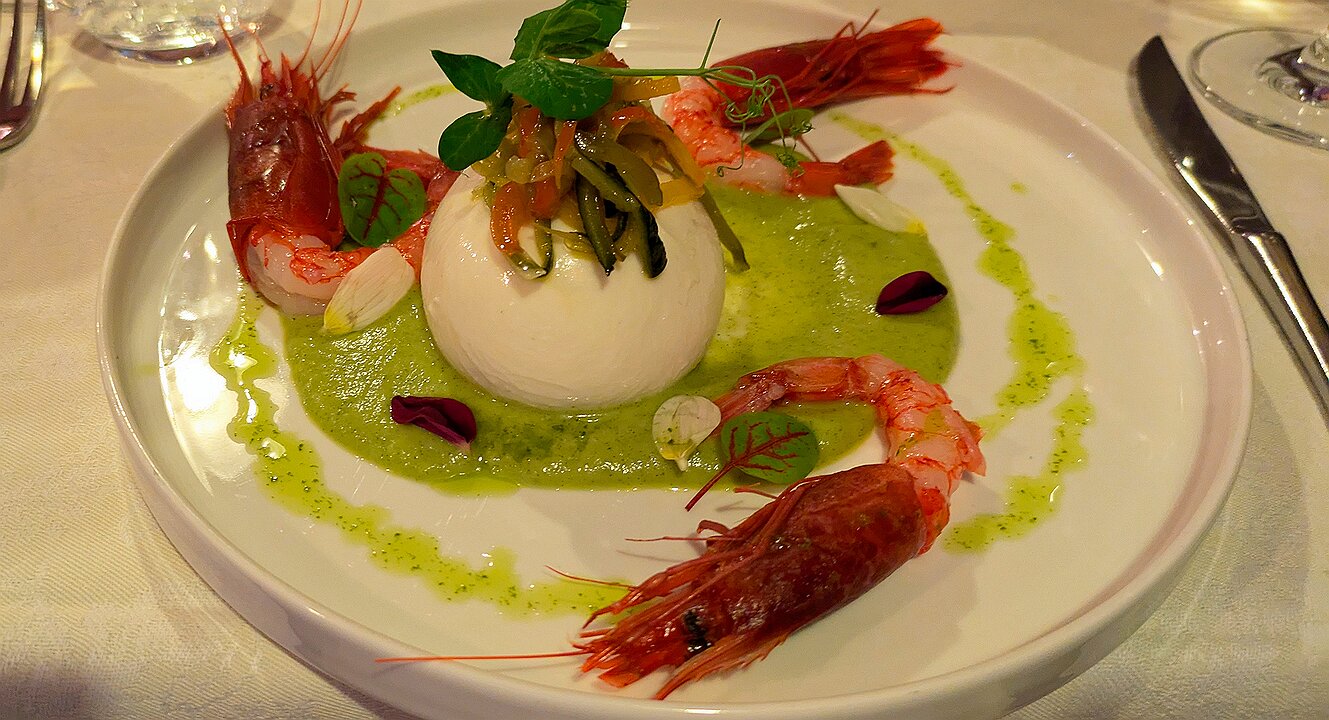 Burrata and red prawn, Italy, Osteria del Tempo Perso, Ravenna