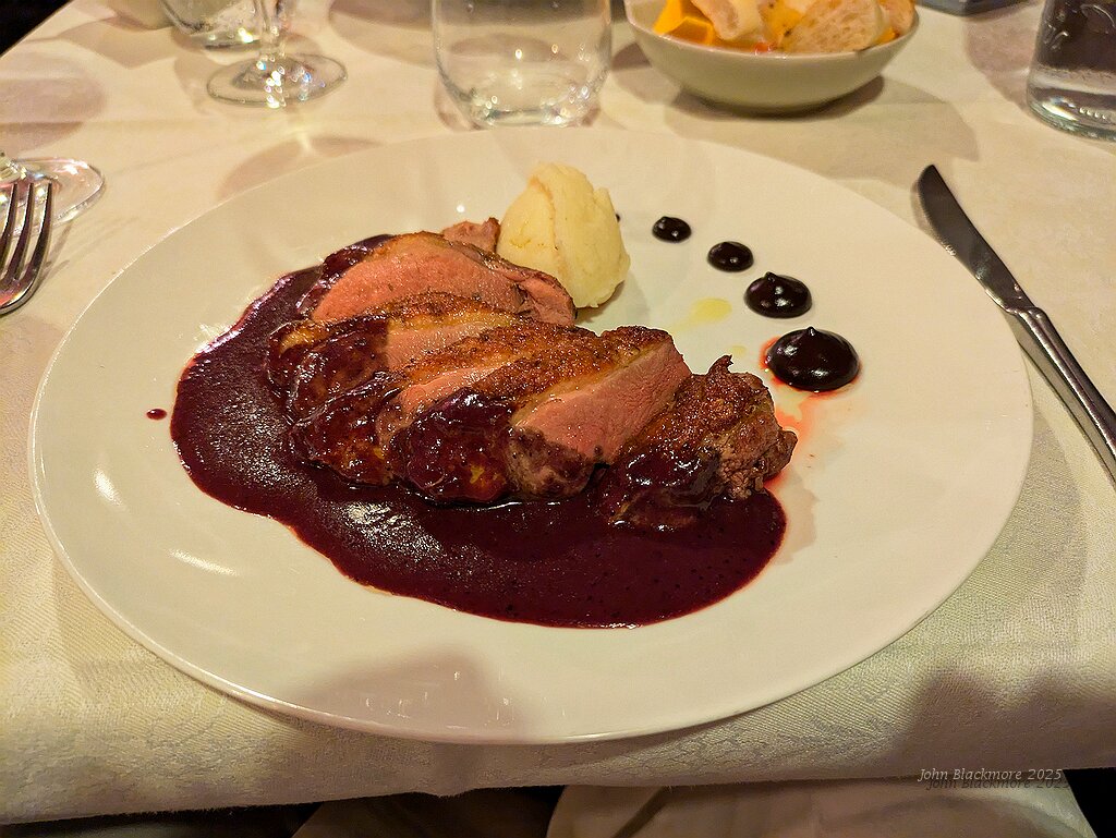 20240622_PXL182826053_DxO-DP7natural_Pixel7a-JEB Petto d'anatra, aglio nero, purè di patate e salsa ai frutti di bosco (Duck breast, black garlic, mashed potatoes and berry sauce) 24€