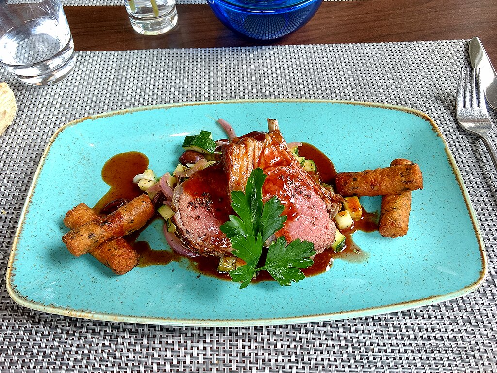 Main: Carré d'agneau rôti au thym serpolet, fricassée de courgettes, tomates grappes, poivrons, olives pitchouline, jus d'agneau