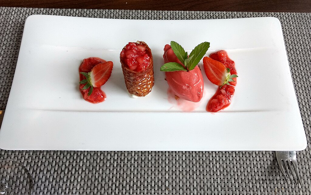 Dessert: Croustillant de fraises au poivre timut, crème glacée à la citronelle thaï