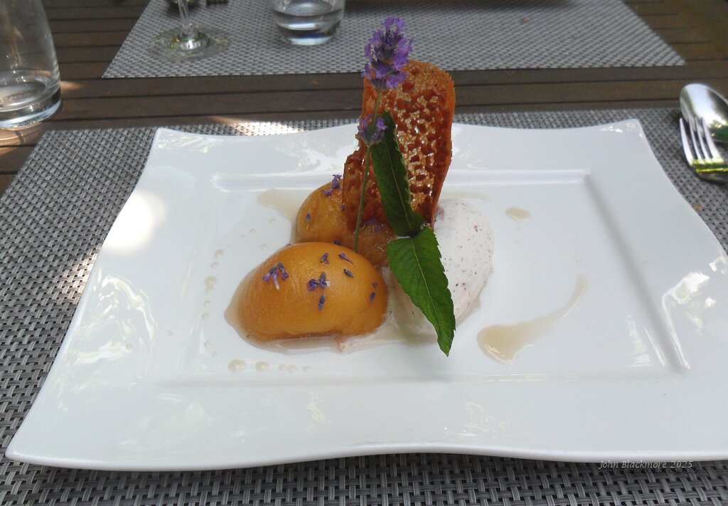 30€ - Pêche rotie au miel et à la lavande, tuile et crème glacée amande
