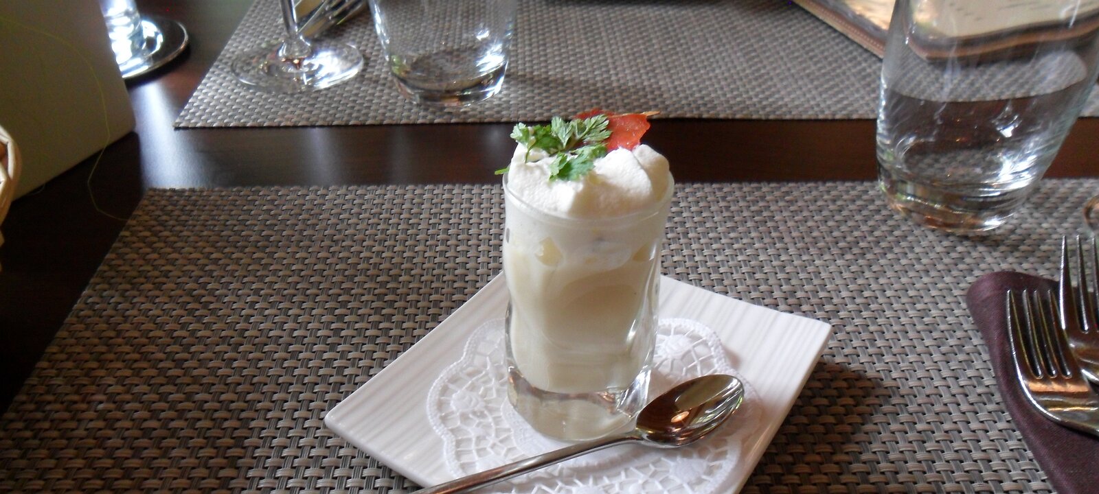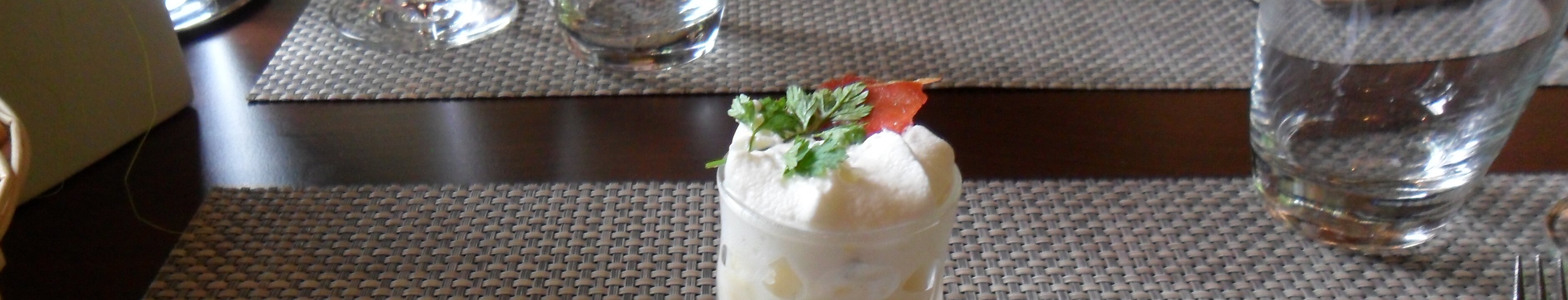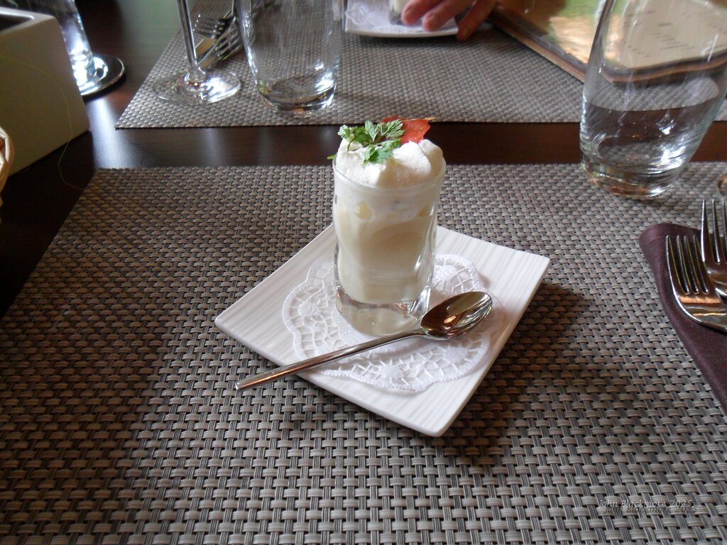 amuse bouche: asparagus soup with bacon and foam