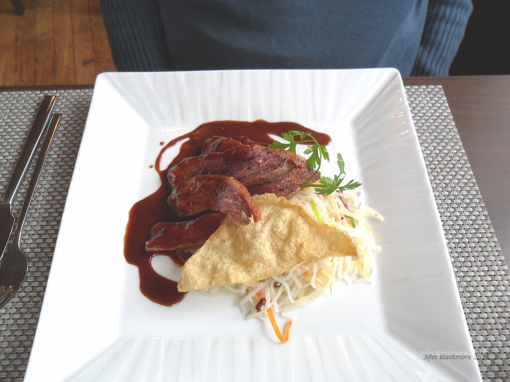 Menu Carola main: Filet de Canette poêlé au poivre tellicherry (Originaire de la côte de Malabar en Inde son nez est épicé et boisé), Nouilles de riz, légumes
