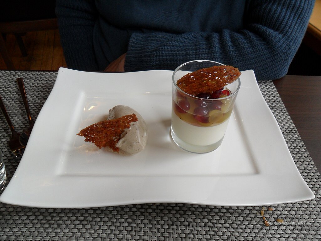 Menu Carola dessert: Blanc-Manger aux amandes, salade de raisin, crème glacée aux noix