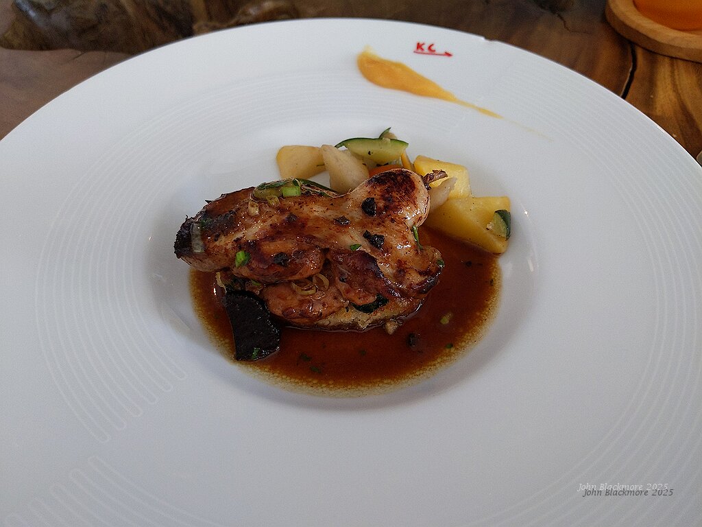 quail on foie gras wiith quince jam and vegetables