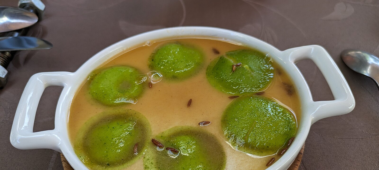 veal, sweetbread, risotto, zucchini and apple wrapped in green bean, carrot juice