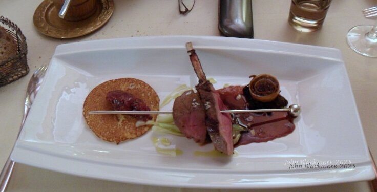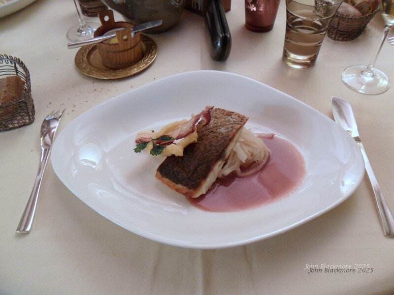 first course: Filet de maigre rôti, confit de navet, jus verjuté (maigre = shad)