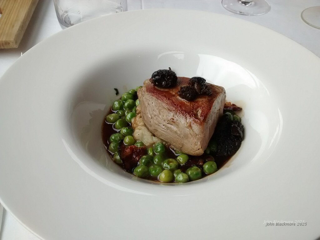 main: Le quasi de veau élevé dans notre beau pays, rôti et servi rosé & fine purée d'artichauts Macau, petits pois au lard et jus aux morilles