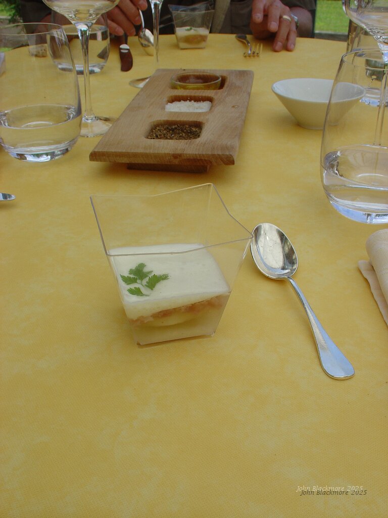 amuse bouche - potato, Black Forest ham, emulsion, coriander