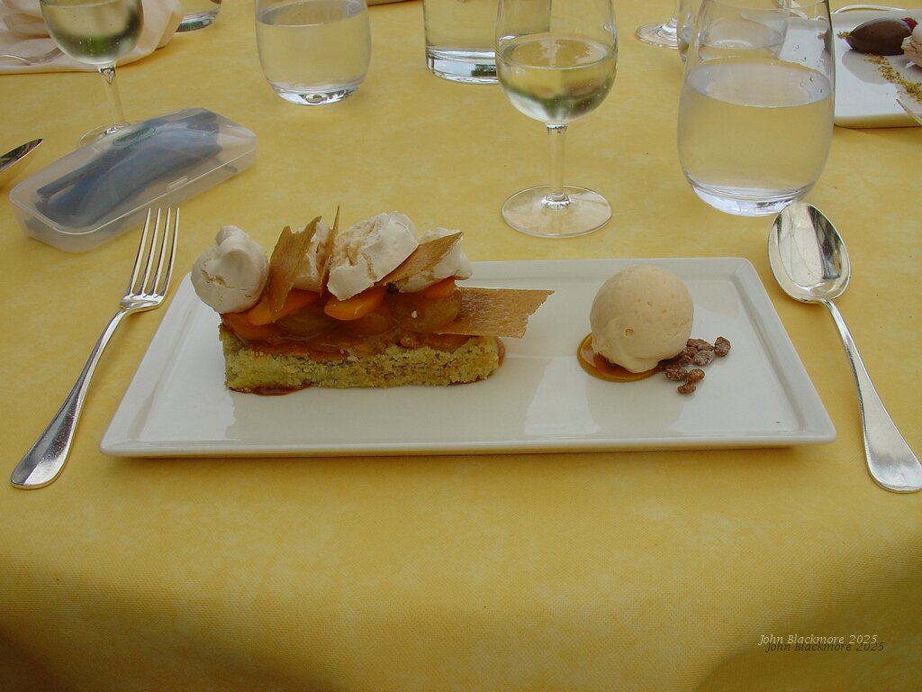 dessert - L'abricot en tarte très moelleuse, nappage vanille, amandes caramélisées et le tout meringué, Glace au lait dans l'esprit "danao"