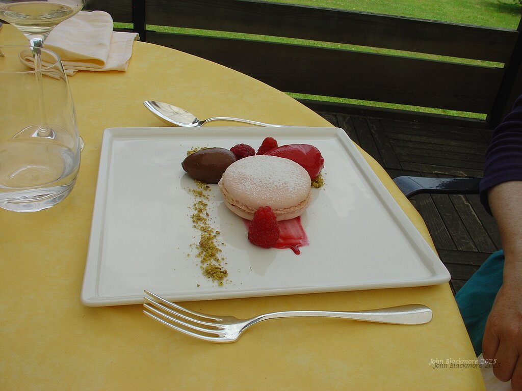 dessert - Les framboises en gros macaron, chocolat noir onctueux, Sorbet du même fruit