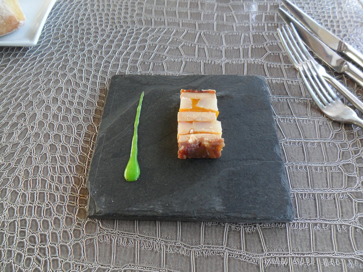 31€ menu: L'éveil du palais/amuse bouche - ham, scallops, foie gras with wasabi sauce