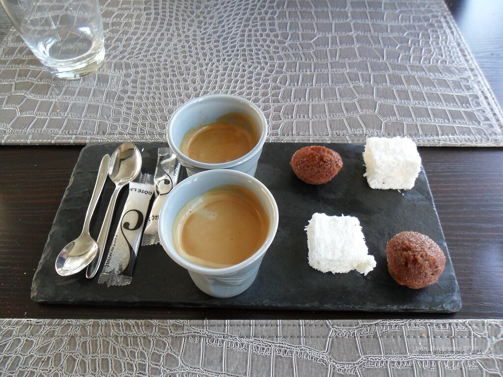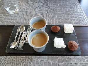 20130923_SAM_1455_ES71 31€ menu: L'éveil du palais/amuse bouche - ham, scallops, foie gras with wasabi sauce