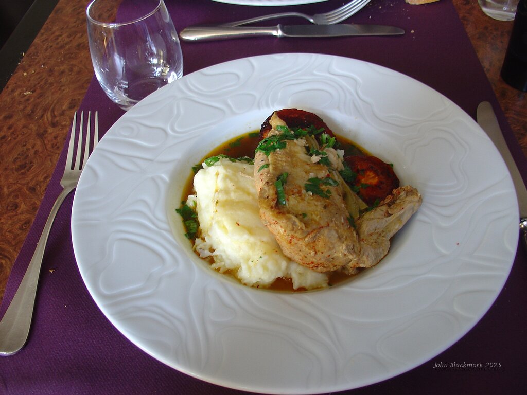Supreme de volaille braise a l'ail, pommes de terre eclatees cremees, tomate sucree